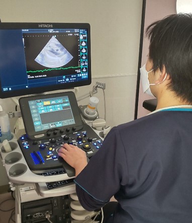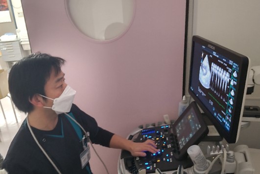 超音波機械の難しい機能を使いながら、黙々と検査をする馬場先生。いつも真剣です。