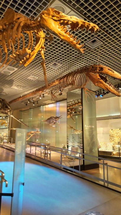 知る人ぞ知る国立科学博物館の秘密(?) 常設展・地球館地下2階に太古の海の生物の骨格標本が展示されているのですが、その足元に海を模したライトアップがされていて、時々お魚が泳いでいる影が出てきます。ごくまれに恐竜も泳いできます。見つけてみてください!