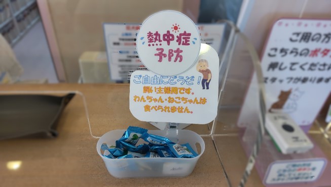 少し外に出るのもためらうくらい熱い日もありますが、ご来院してくださる飼い主さまにと、当院受付カウンターに熱中症予防の飴をご用意しています。どうぞご活用ください。遠慮なさらず召し上がってくださいね。