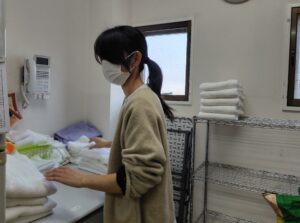 外来や入院室で使用したタオルの洗濯や掃除が主な業務ですが、私たちでは手がかけられない部分を補っていますので、なくてはならない存在です。