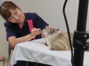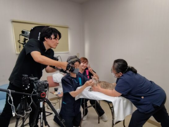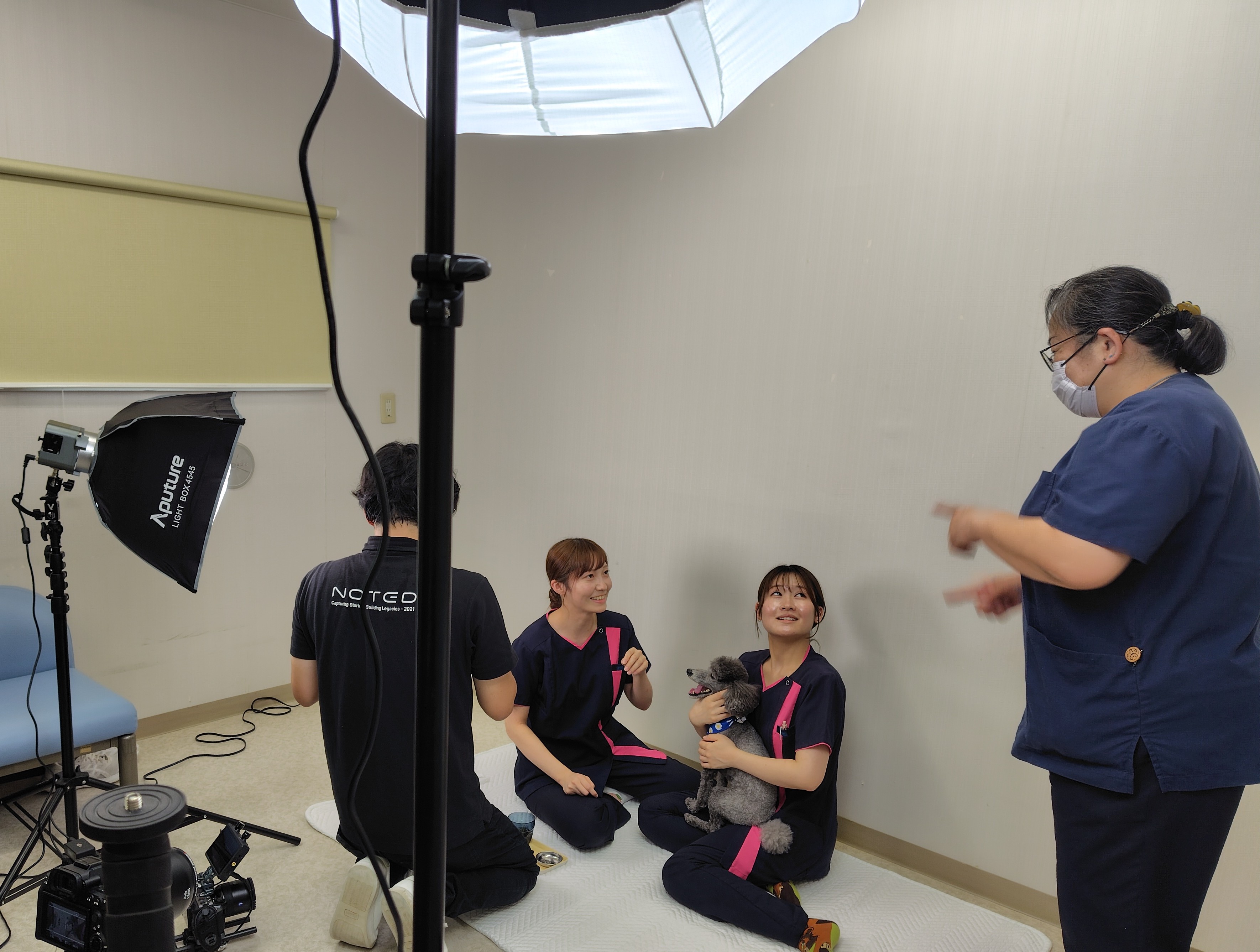 出演者は院長と愛玩動物看護師・元井です。犬のモデルとして参加したのは、スタッフ関千都の愛犬。猫のモデルは我が家の猫が参加しました。我が家の猫が撮影に協力的であってほしいので、見守るだけでもドキドキでした。