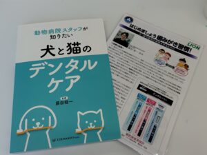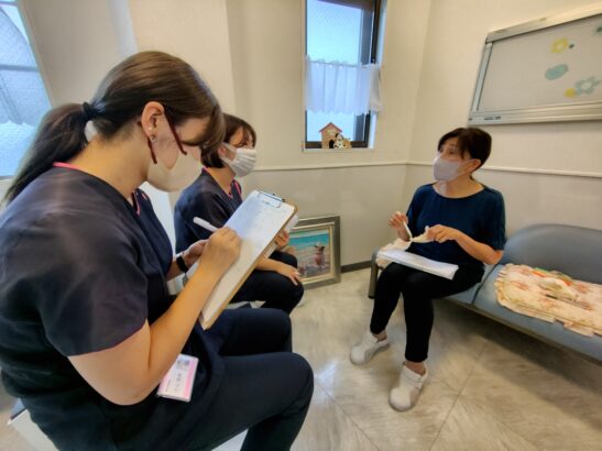 普段、婦長は病院の経理の仕事をしているため、皆さまと顔を合わせる機会はほとんどありませんが、経理の仕事の合間にこうした時間を設けています。予防歯科に関する飼い主さまからの質問への最良の答え方から歯みがきのやり方まで、様々な事を婦長とお話しながら楽しく学んでいます。人の歯についても知ることが出来るので、自分の歯も考えてみたり、とても有意義な時間です。