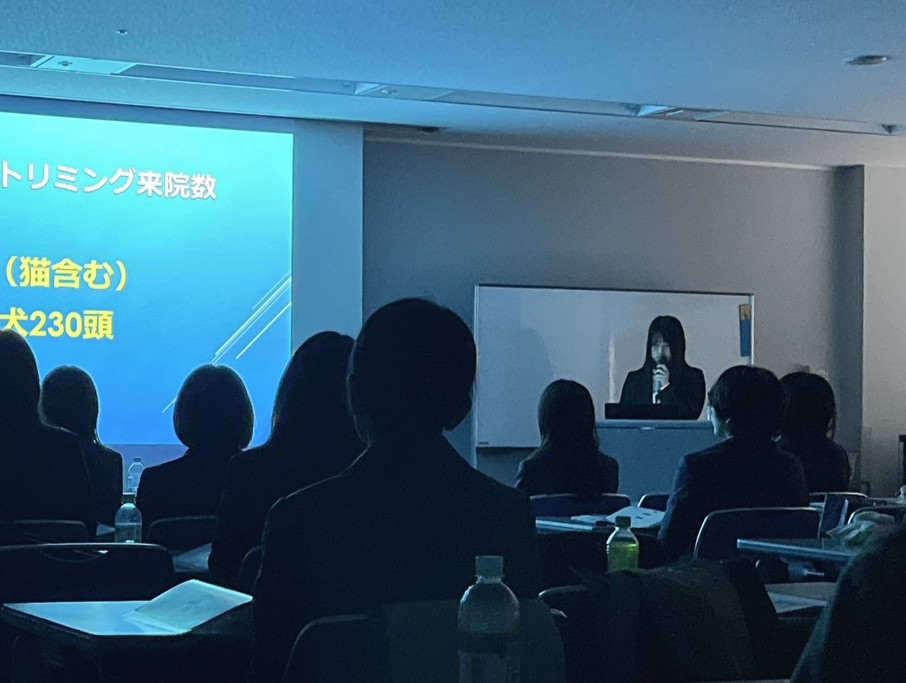 当院からは獣医師・小暮、山本、庄司、石山、愛玩動物看護師・堀江、トリマー・早川が発表しました。こういった症例検討会での発表が初めてなスタッフも準備の段階からかなりの努力をし、院内での予演会では先輩からの愛のある厳しい意見を受け止め、改善に改善を重ねて発表に挑みました。ですので、発表よりも準備が大変過ぎて苦しい場面もあったそうです。その甲斐もあり、とても良い発表でした。みんな頑張りました!
