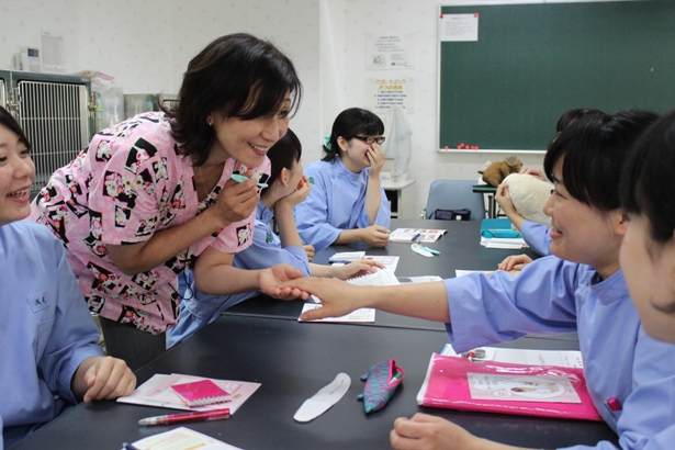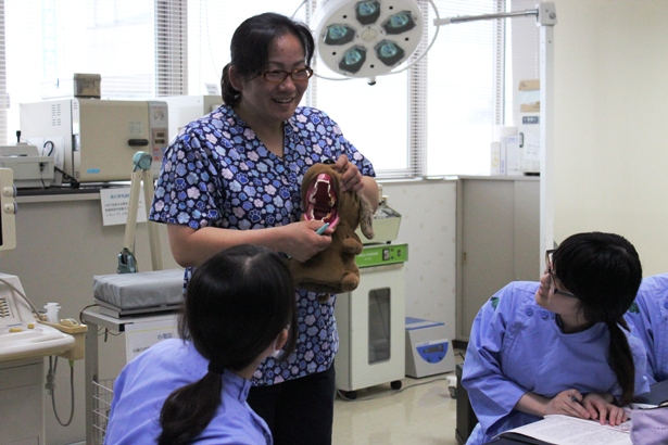 院長が口腔内の解剖と生理、歯周病の診断と治療などについての授業を行い、婦長と山地獣医師、三浦看護師、須永看護師によりデンタルケアについて実習しました。