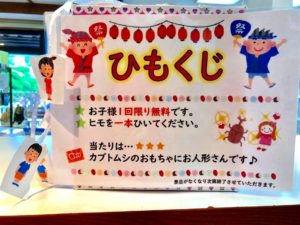 さて、今年も夏休み中にお子様向け企画を開催させていただきました。今年は『ひもくじ』で本院とグルーミングガーデンに来院された患者さまのお子様限定です♪当たりは男の子にはクワガタのおもちゃ、女の子にはお人形です☆男の子、女の子の絵柄がついた紙を引いたらおもちゃが釣れます。
