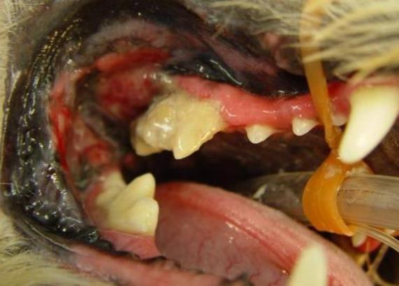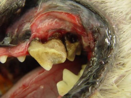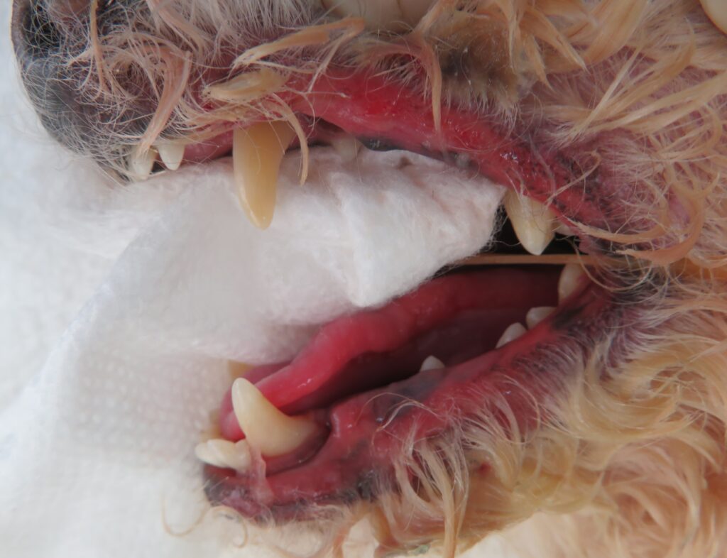 歯周病などでは歯についた歯垢・歯石や細菌などが刺激となり粘膜が反応して、歯肉が赤くなり潰瘍ができます。それに伴って、口腔内に痛みが生じるため食事をすることを嫌がってしまうようになります