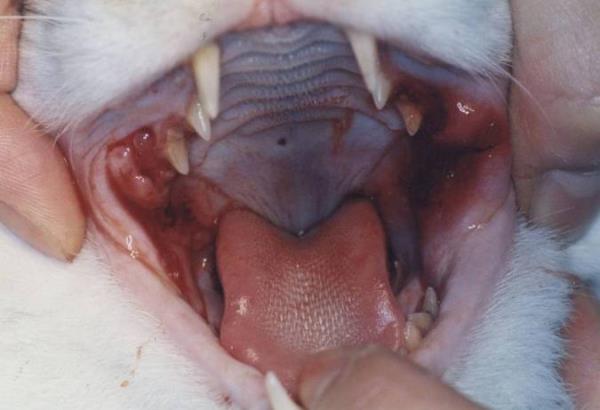 猫では口に痛みを生じる病気として歯肉口内炎があります。原因ははっきりとはしていませんが、歯周病との関連、猫白血病ウイルスや猫免疫不全ウイルス、猫カリシウイルスの感染、免疫的な異常などが関与していると考えられています