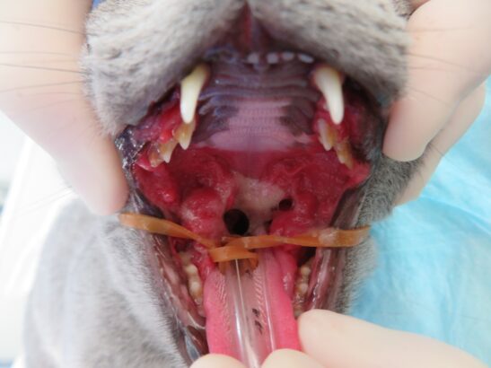 猫の歯肉口内炎の治療には抗生剤やステロイドなどの薬が用いられますが、効果が無い場合は全臼歯抜歯や全顎抜歯など多くの歯を抜くことで症状がよくなることがあります。この外科処置の治療効果は60%で改善、20%でわずかに赤い口腔粘膜は残る、13%で他の治療が必要、7%で残念ながら外科的治療効果は得られないと報告されています