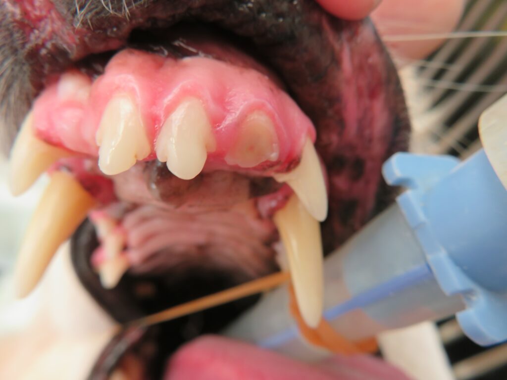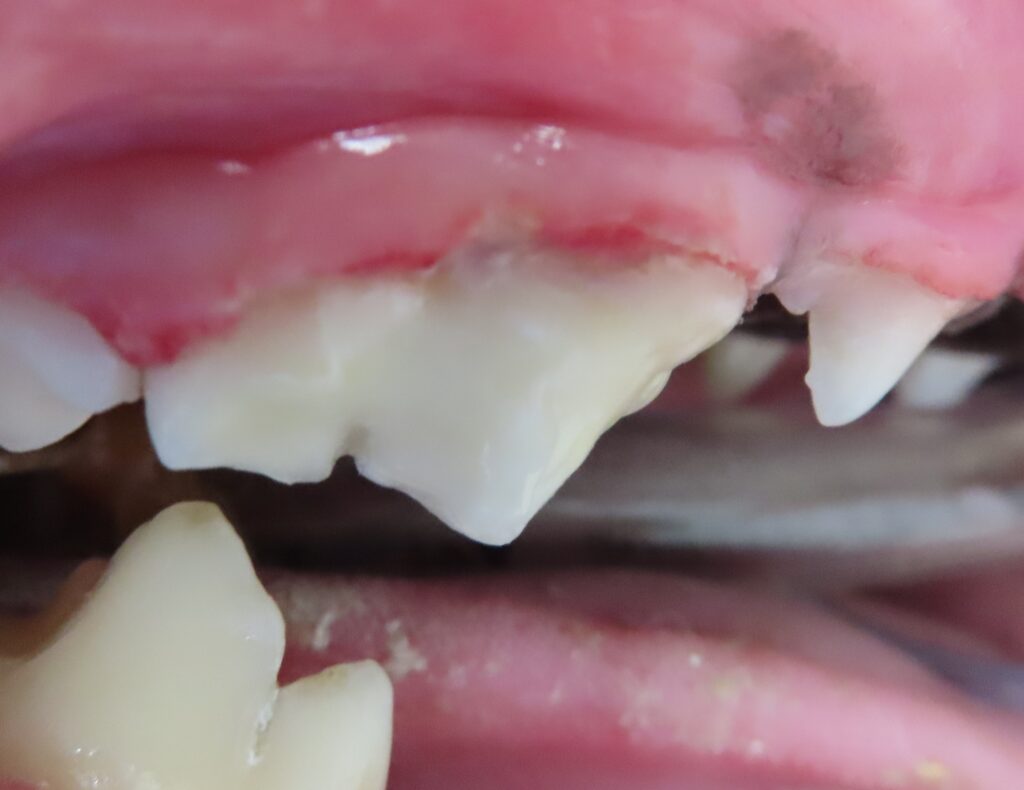 特に犬の場合、上あごの奥の大きな歯(上顎第四前臼歯)の破折が非常に多く、写真のように歯髄(いわゆる歯の神経)が露出して赤くみえることがあります。この状態を露髄といい、これを放置すると、最近が露髄した部分から入り込み、歯髄炎から歯髄壊死に至り、その後、歯の根っこの強い炎症(根尖周囲病巣)、さらには外歯瘻、内歯瘻に進行することがあります。