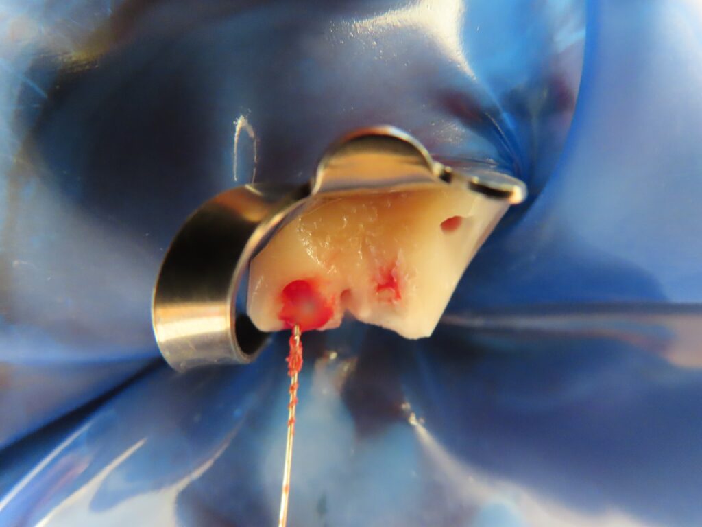 歯に歯根に通じる穴をあけます。その穴から歯髄を抜いて(抜髄)、根管を拡大・形成します。洗浄・乾燥させて後、拡大した根管に、詰め物をしていきます
